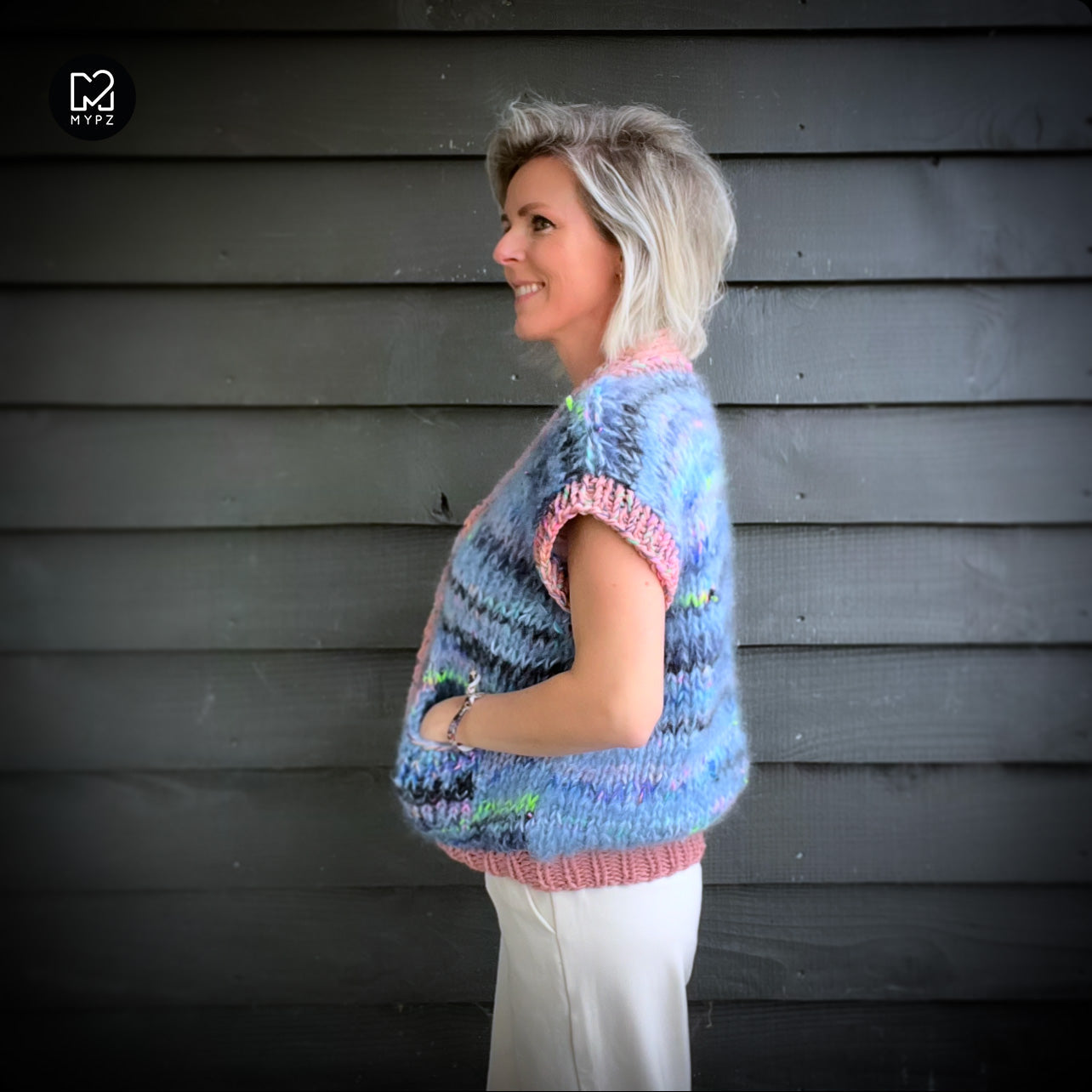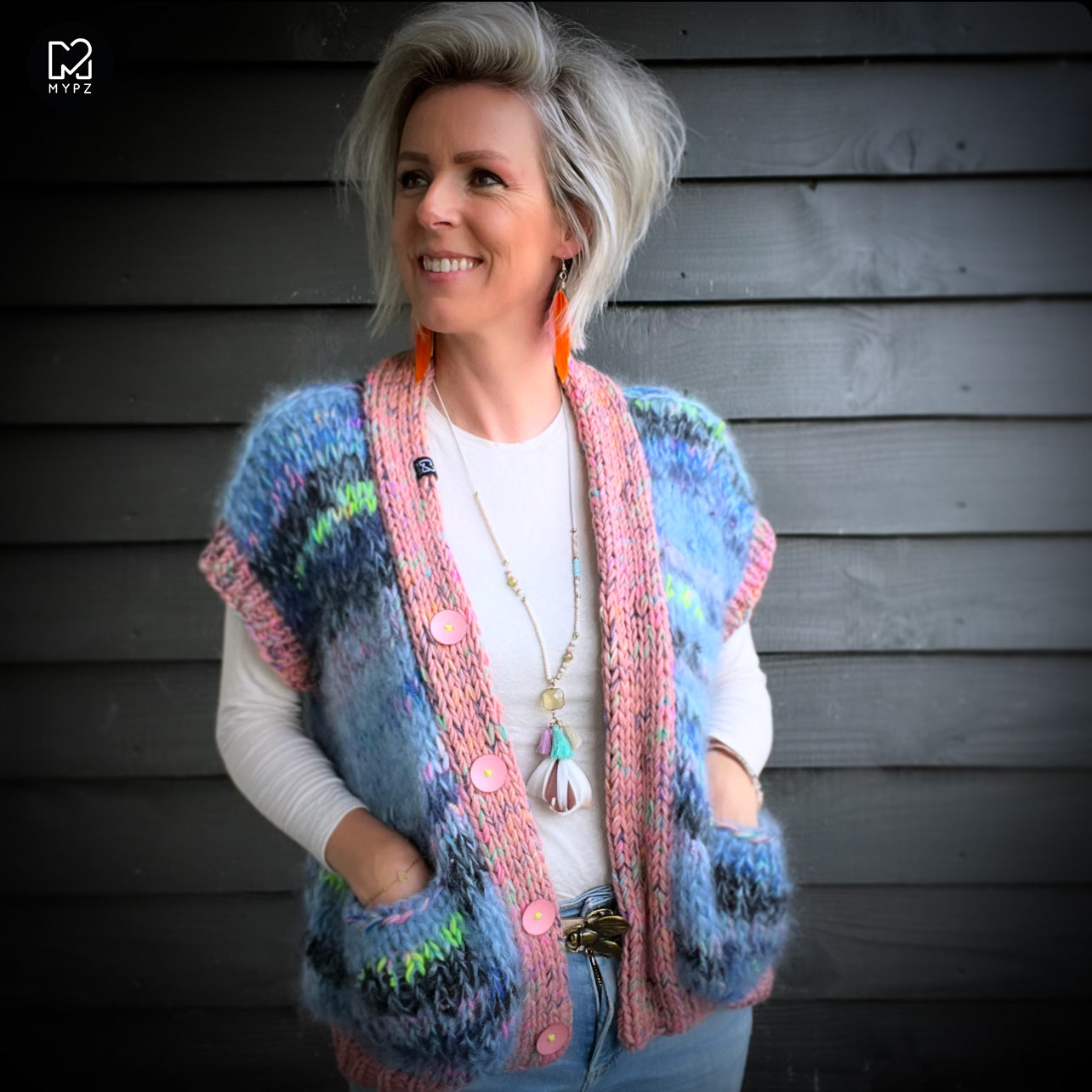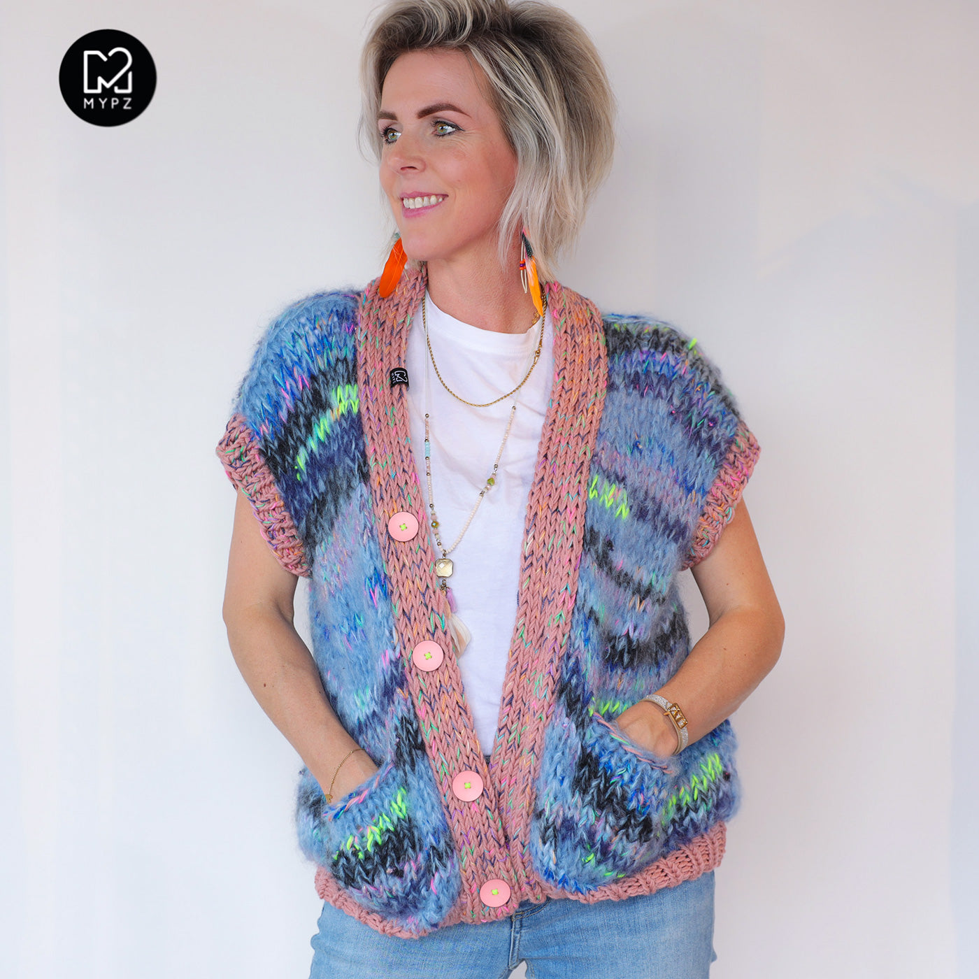 Use of color: This bodywarmer requires you to tie many pieces of yarn together. Cut random lengths of each color (we have used lengths of ± 140cm) . The longer your piece of yarn, the wider that color will be in your cardigan. Tie all the lengths together into a large ball. You need to make tight knots! These knots can be visible in your work (we like that!)