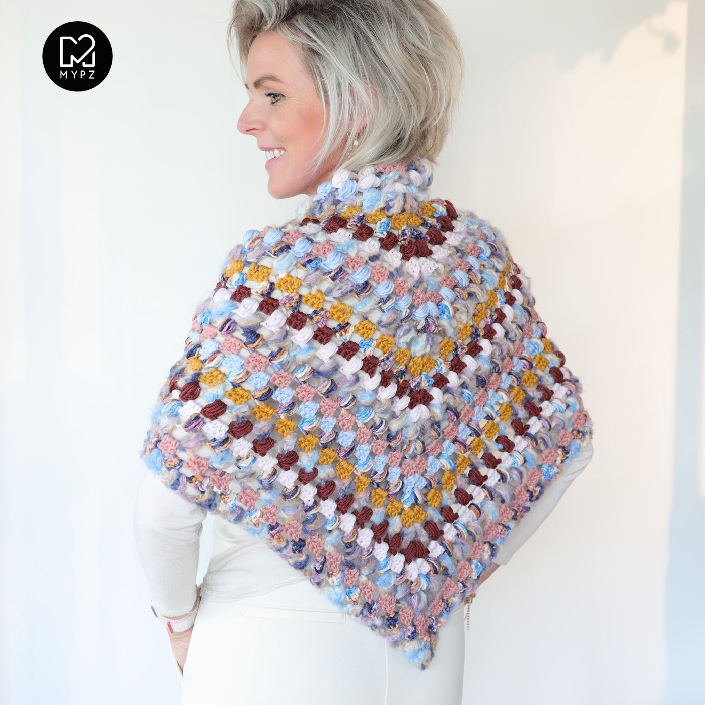 Dit is een eenvoudig patroon. Wij vertellen je stap voor stap wat je moet doen. Het hele patroon wordt ondersteund met een diagram waarop het aantal steken wordt weergegeven. Deze omslagdoek is zeer licht, warm en comfortabel. Deze omslagdoek is gemaakt met MYPZ handgeverfde Suri Silk DK, MYPZ handgeverfde Aran Merino + MYPZ Super Soft Merino, ideaal voor mensen met een gevoelige huid.