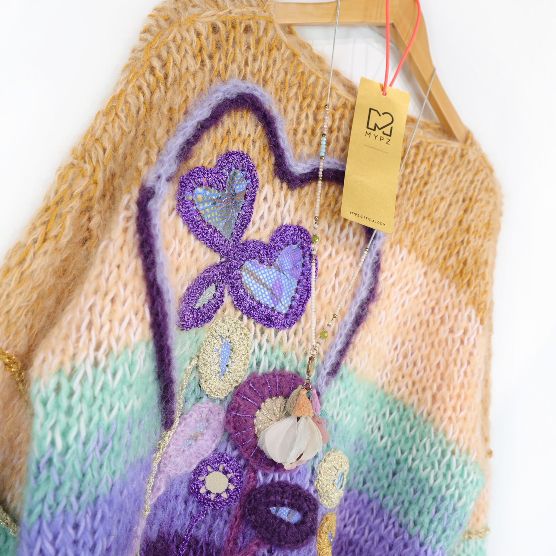 This is a handmade knit made by MYPZ in The Netherlands. Each cardigan or sweater is a unique piece and we take a lot of time and care to create these beautiful products. This beautiful sweater is made of a high quality mohair and does not pill. It is very light, warm and comfortable. These brushed yarns may shed a little but after a while, this will subside.