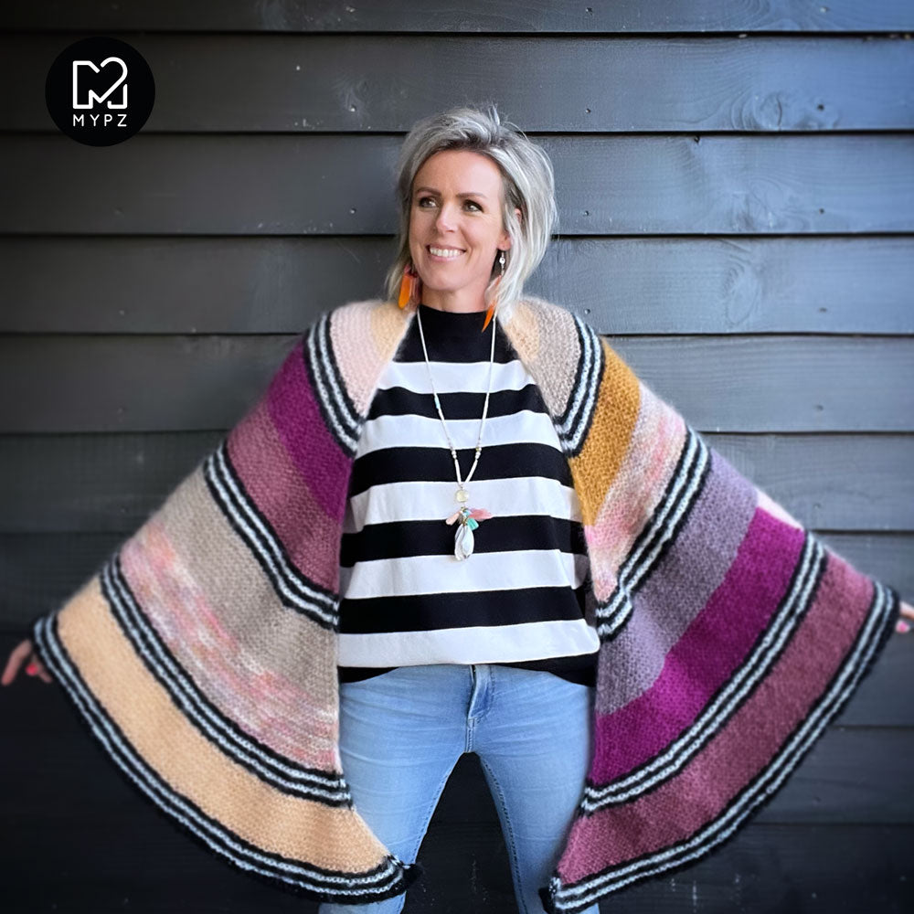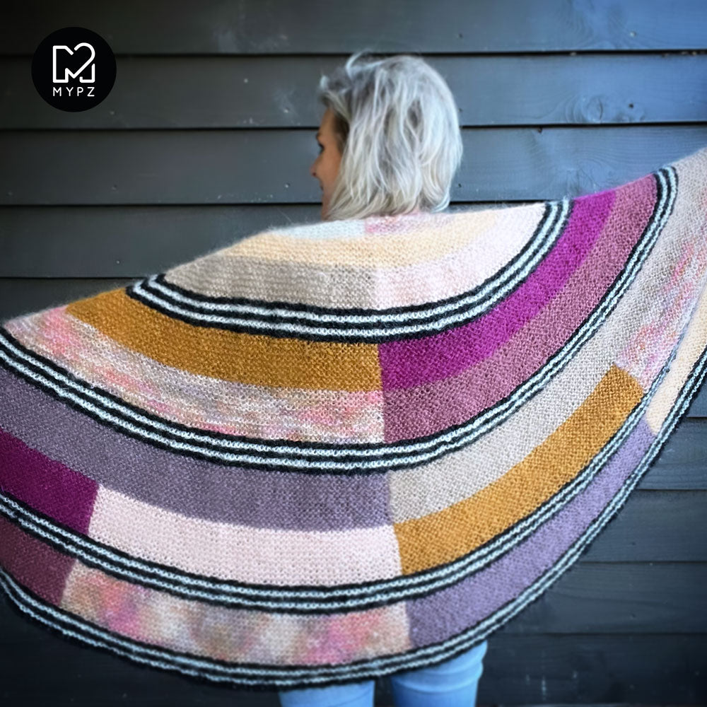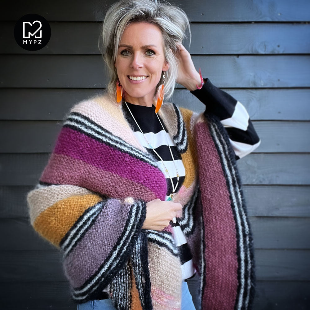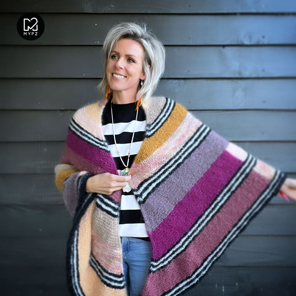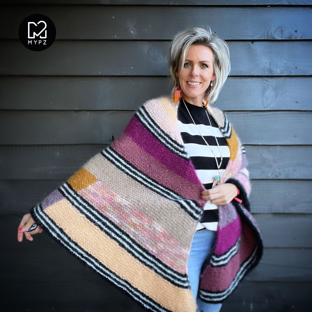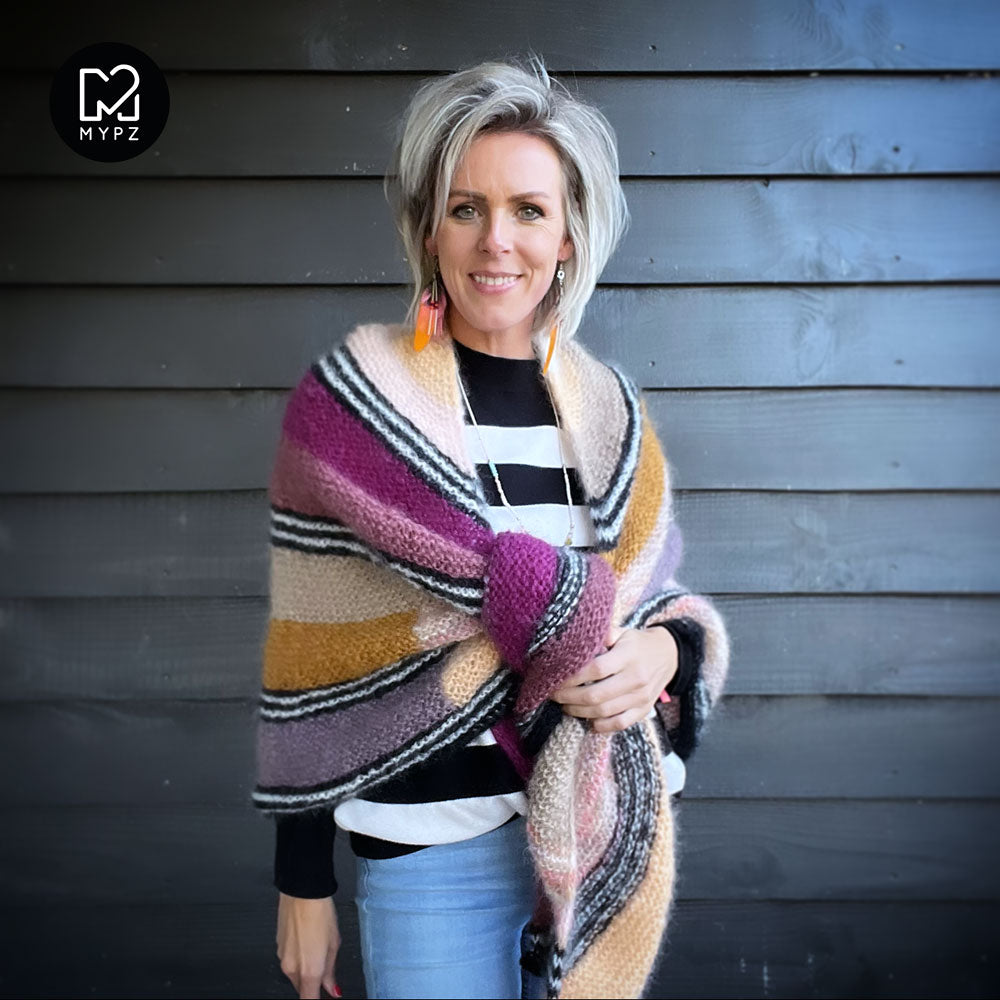 Deze omslagdoek is heel licht, warm en comfortabel. Deze kit bevat MYPZ Chunky Kidmohair DK, een hoogwaardig fijngeborsteld mohair garen.