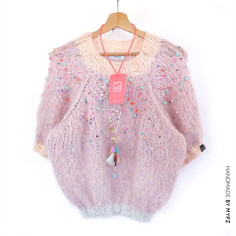Garen: Je breit deze trui bijna volledig met 1 draad MYPZ chunky kidmohair DK Powder Pink + 1 dunne draad MYPZ Kidmohair Light Purple.